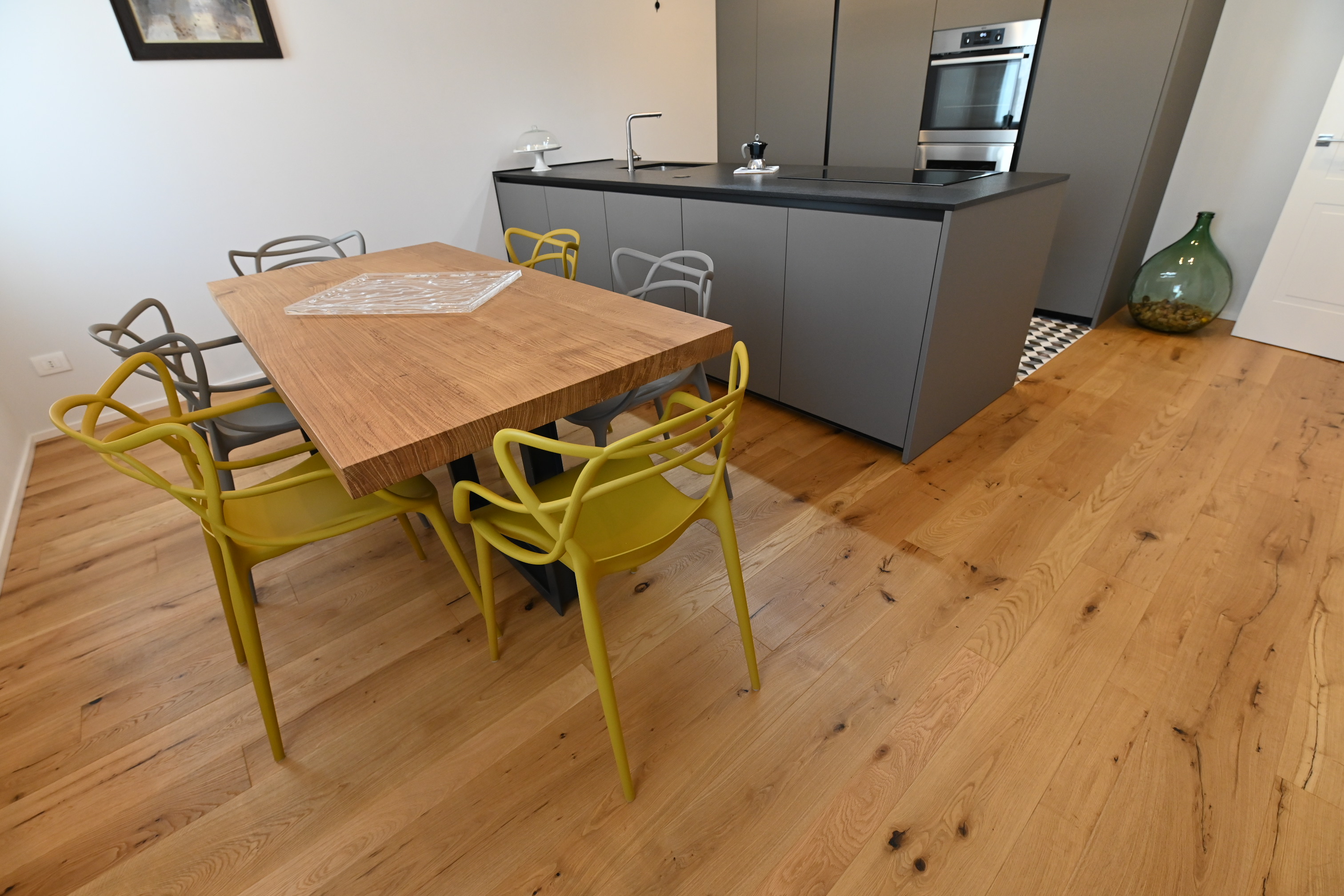 1683 | Legno Di Rovere In Quattro Larghezze, Accostamento E Personalizzazione Di Due Pavimenti In Zona Cucina